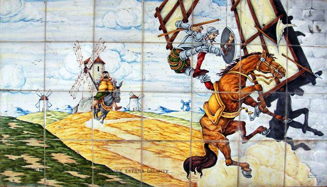 “Encomendándose de todo corazón a su señora Dulcinea, pidiéndole que en tal trance le socorriese, bien cubierto de su rodela, con la lanza en ristre, arremetió a todo el galope de Rocinante, y embistió con el primer molino que estaba delante; y dándole una lanzada en el aspa, la volvió el viento con tanta furia, que hizo la lanza pedazos, llevándose tras sí al caballo y al caballero, que fue rodando muy maltrecho por el campo.”