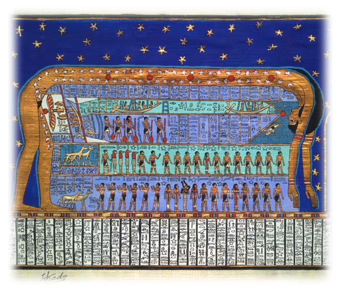 ([1]) La Reina Nut: Diosa del Antiguo Egipto, representaba el cielo. Suele aparecer como una mujer con el cuerpo arqueado y cubierto de estrellas. Engullía al sol cada tarde quien recorría su cuerpo y mostraba su forma renovada cada mañana. Hija de Shu (Dios del aire) y Tefnut (Diosa del agua), era esposa de Gueb (Dios que representa la tierra = Egipto), con el que tuvo cuatro hijos: Osiris (Rey de los Infiernos), Isis (Diosa de la fecundidad), Set(Dios del Desierto) y Neftis(Protectora de los sarcófagos y los Vasos Canopos que contenían las visceras del difunto). Para completar la fábula del “epagómenos”, necesitaba un quinto hijo: Horus el Jóven, (hijo a su vez de Osiris e Isis), ya que Osiris también era conocido como Horus el Viejo. Ra, junto a la Diosa del Cielo, Geb y sus cinco hijos formaban la Enéada de la Heliópolis.
